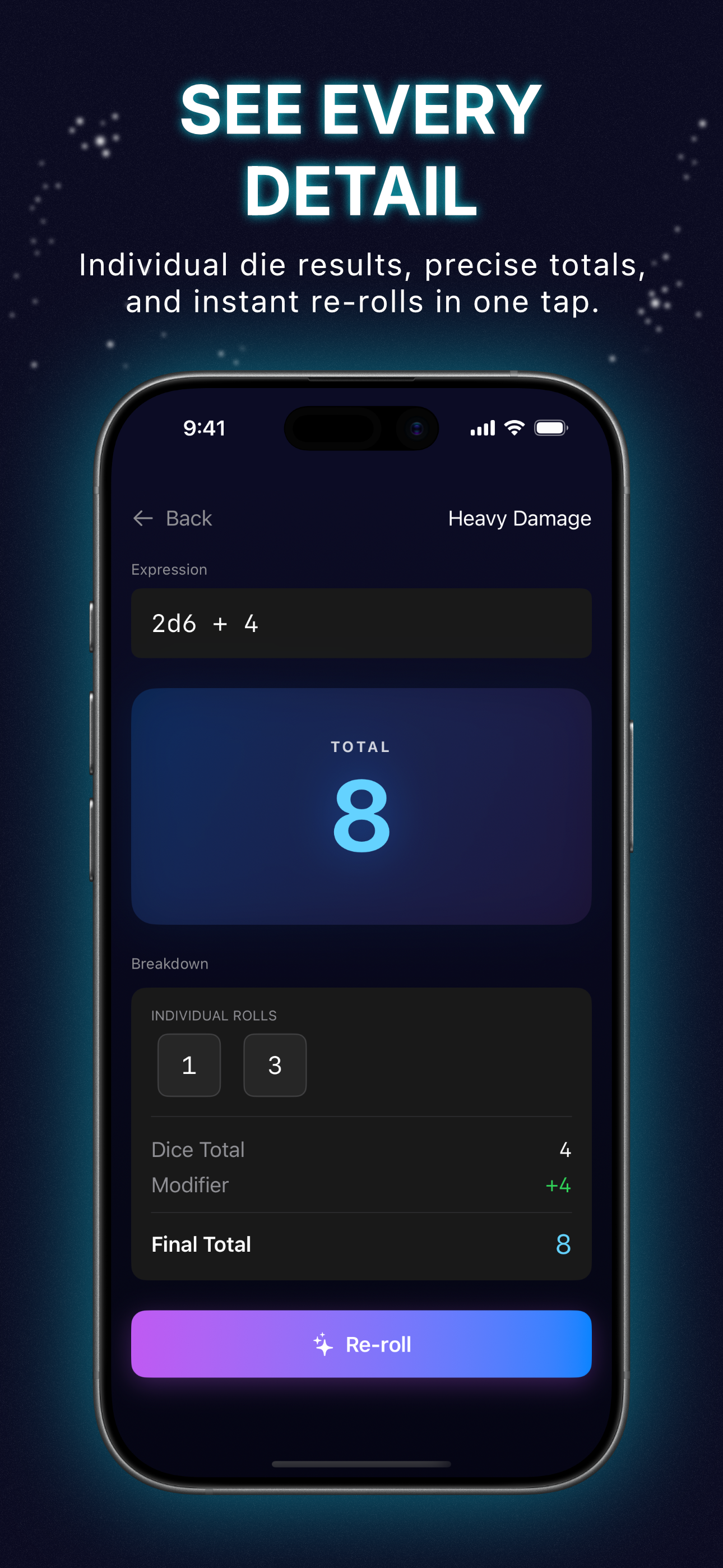 • Detailed Breakdown: See exactly what you rolled. No more "fast math"—we show the individual die results plus the final total.